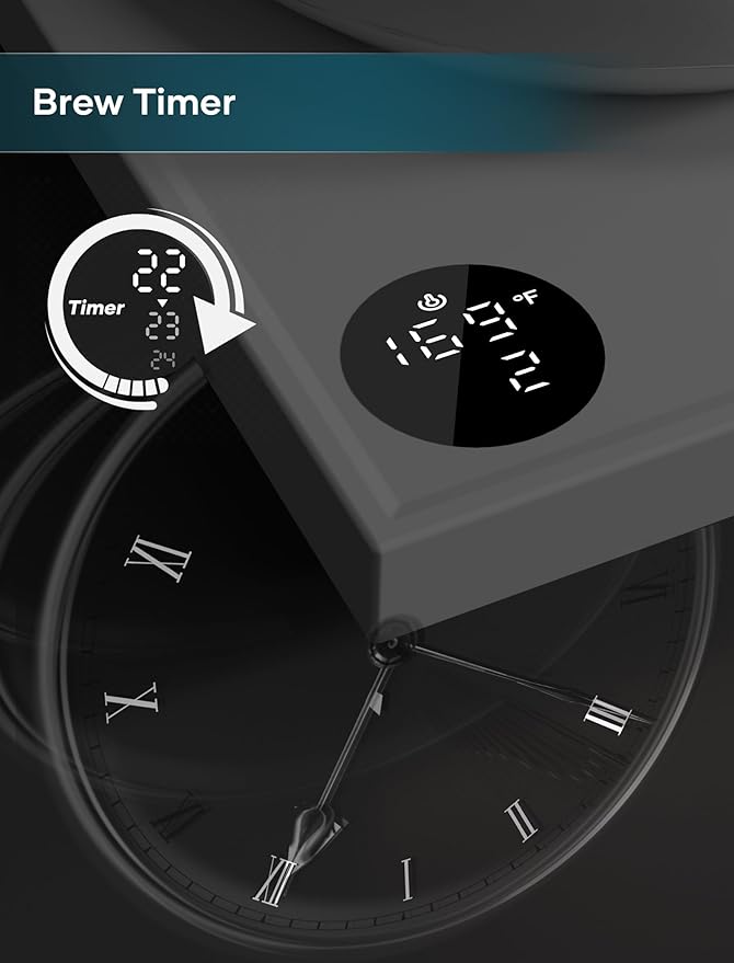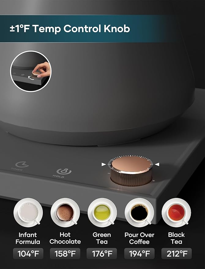 - ±1℉ Temperature Accuracy - The intelligent base's built-in temperature control program. The program will adjust the heating power when the water temp approaches the desired temp according the temp probe detects the temp change.