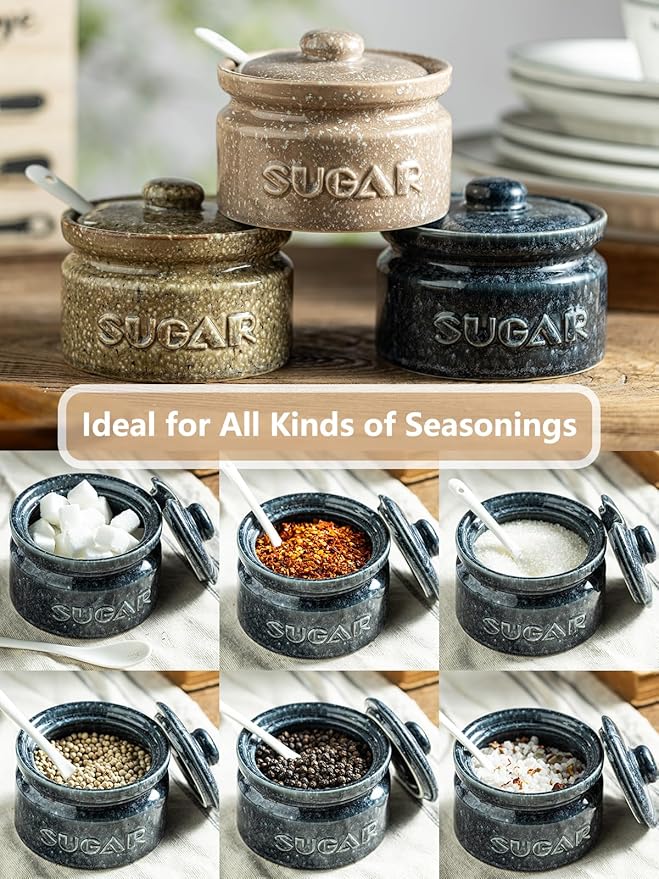 - PERFECT SIZE FOR MULTIPLE USE: With the 10-ounce capacity, this sugar bowl is the ideal size to meet your daily sugar needs. You can use this sugar jar to store a variety of seasonings, such as sugar, salt, spices, creamer, pepper, MSG, garlic paste, ketchup, loose tea, oil, honey, and more. It is the perfect addition to any home coffee station.