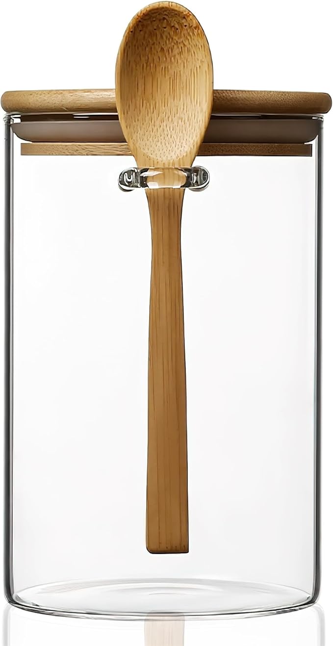 25 oz/750 ml Glass Storage Canister with with Airtight Lid, Cute Clear Decorative Container Jar with Wooden Spoon for Coffee Spice Candy Salt Cookie Condiment Sugar Matcha Tea Overnight Oats