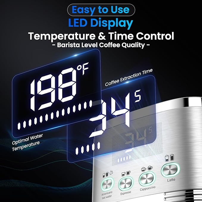 - Cappuccino Machine with Temperature and Time LED Display,expresso machines for home with the intuitive time and temperature, which can clearly show the time of coffee extraction and water temperature during brewing. Three adjustable extraction temperature setting that you can choose different temperature according to your preference, 198℉ is the optimal temperature for coffee extraction.