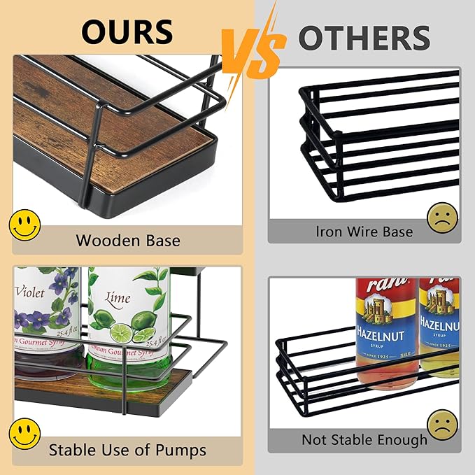 - STURDY & DURABLE: The coffee syrup stand is made of sturdy wood and metal, which has smooth surfaces without worrying about stabbing hands. You can use the syrup pump while the bottle is on the syrup stand for coffee bar