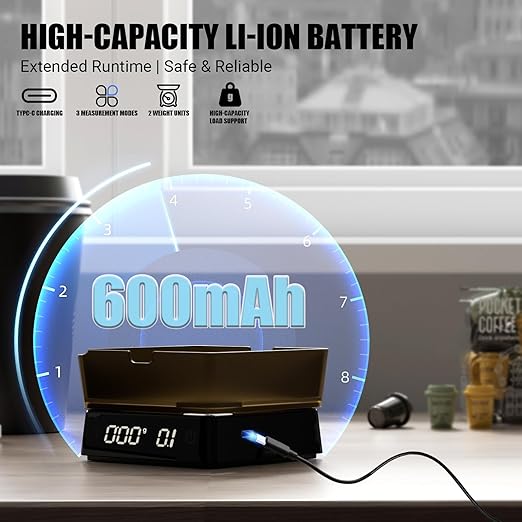 - Type-C Fast Charging & Long Battery Life – Equipped with a built-in 600mAh rechargeable battery, this coffee scale supports Type-C fast charging and provides extended use on a single charge. More eco-friendly and efficient than traditional battery-powered scales, it reduces the hassle of frequent charging and meets the needs of home brewing and travel use.