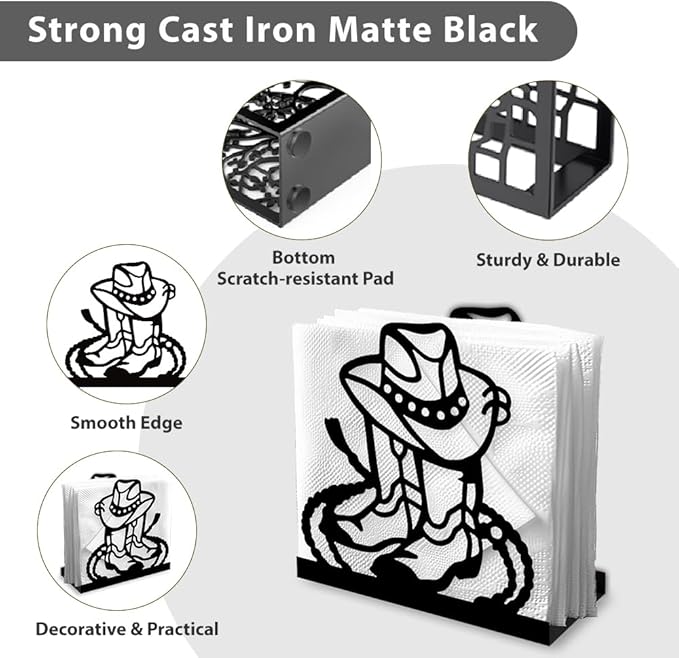 Cowboy Boot Decorative Black Metal Napkin Holder for Table, 4.9" x 4.9" x 2" Western Hat Lasso Standing Napkin Holder for Home Kitchen Restaurant Picnic Party Coffee Bar Dining Room