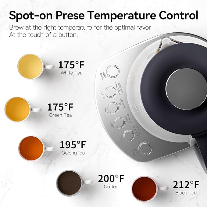 - 6-in-1 Design: This electric kettle with temperature control provides precise temperature control to perfectly extract the flavor of white tea, black tea, green tea, dark tea, and coffee. You can easily select the type of coffee or tea you want with the button. Of course, you can also use the boiling water function directly.