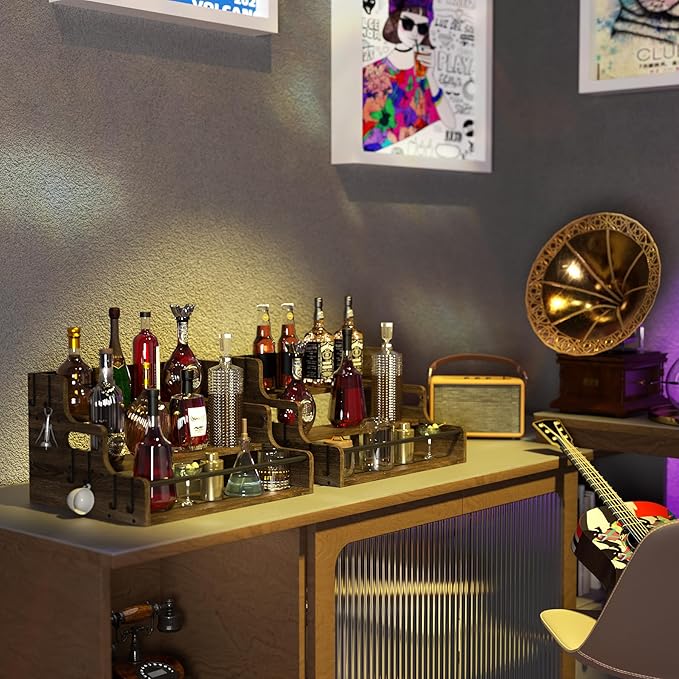 - Durable Wood Frame with Rustic Charm Crafted from premium wood, this liquor shelf brings vintage appeal and reliable support, Perfect for displaying spirits in a bar liquor shelf, whiskey bar, or alcohol cabinet for home