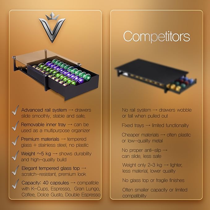 - ELEGANT TEMPERED GLASS – DURABLE & STYLISH : Featuring a scratch-resistant tempered glass top, this capsule drawer adds modern style to your countertop while letting you see your pods at a glance. Built with a solid metal frame and anti-slip rubber feet for added stability and reduced noise.