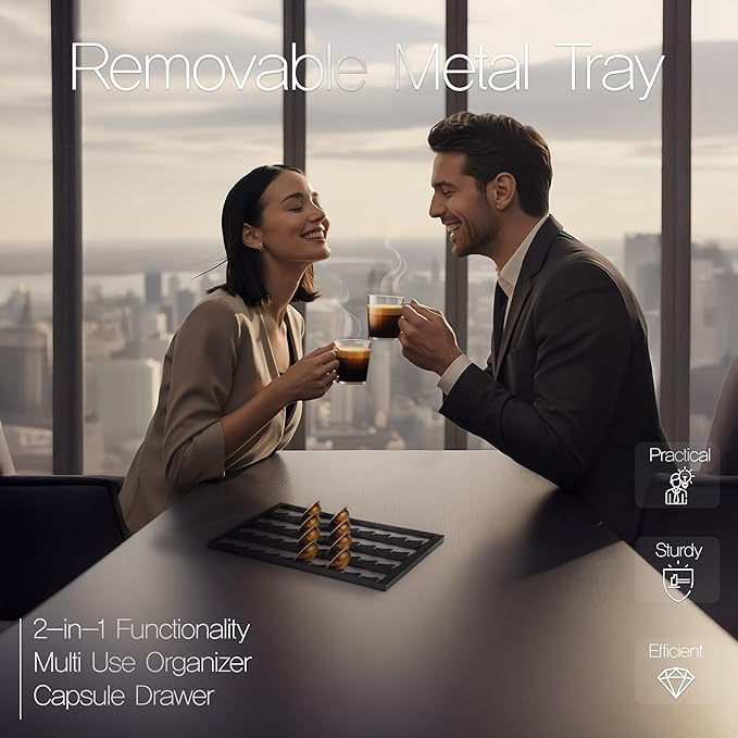 - REMOVABLE METAL TRAY – MULTIPURPOSE & EASY TO CLEAN : The all-metal inner tray is fully removable, making it easy to clean and versatile. Use it for storing coffee pods, mugs, spoons, sugar packs, or other coffee accessories—perfect for any kitchen or office coffee station setup.