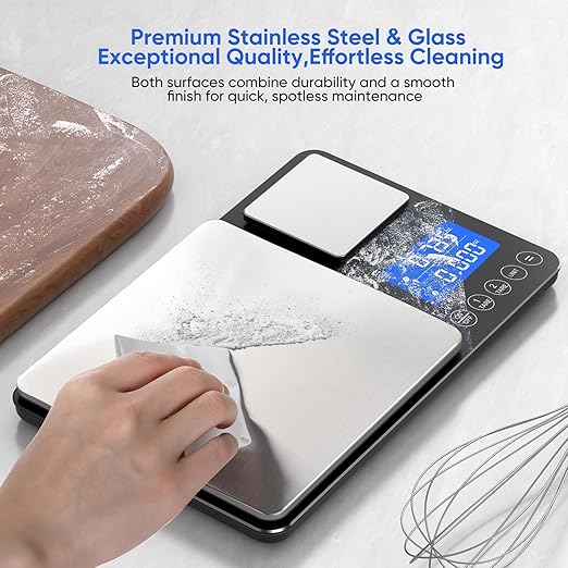 - EASY TO CLEAN: The ApeWeghr food scale features a durable stainless steel surface that is smooth and stain resistant. Its non-porous material prevents dirt and food from sticking, making it quick and easy to clean after each use. Size: 10.8 in. x 7 in.