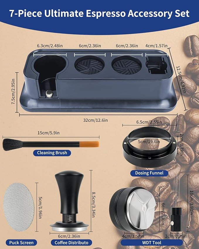 - ✔️ Complete 7-Piece Espresso Accessory Set Includes everything for a consistent shot: 54mm tamper station, coffee distributor & tamper, WDT stirrer, tamping mat, dosing funnel, cleaning brush and puck screen.