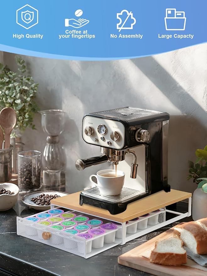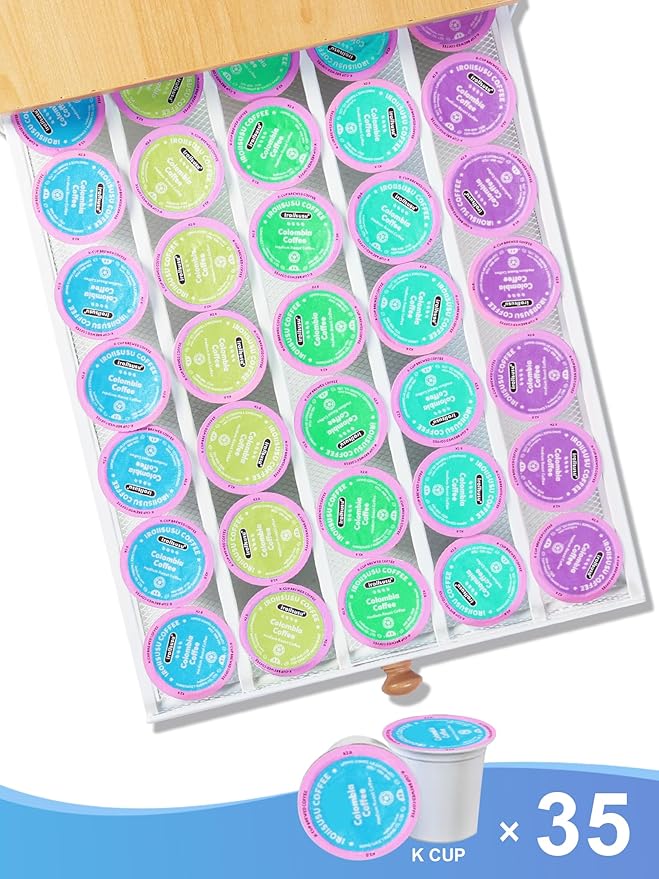 - Large Capacity with Anti-Fall Design: This K-Cup Pod Organizer Holds up to 35 K-Cup Pods and Features an anti-fall Retainer Inside the Drawer to Keep Pods Securely in Place. Built-in Silent Pads Ensure Smooth and Quiet Sliding for a Better User Experience.