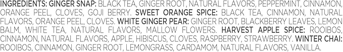 - TEA BLENDS - Ginger Snap (black - caffeinated), Sweet Orange Sprice (black - caffeinated), White Ginger Pear (white - caffeinated), Harvest Apple Spice (herbal - caffeine free), and Winter Chai (herbal - caffeine free).