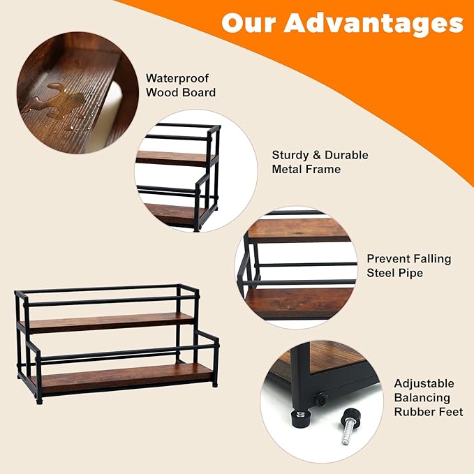 - ✅ Stepped Shelf Visibility: The stepped shelf design keeps everything clearly visible and easy to access. Whether you're reaching for seasonings, tea tins, supplements, or wine bottles, this wine storage rack ensures you can see every item at a glance, making it perfect for fast-paced kitchens or bars.