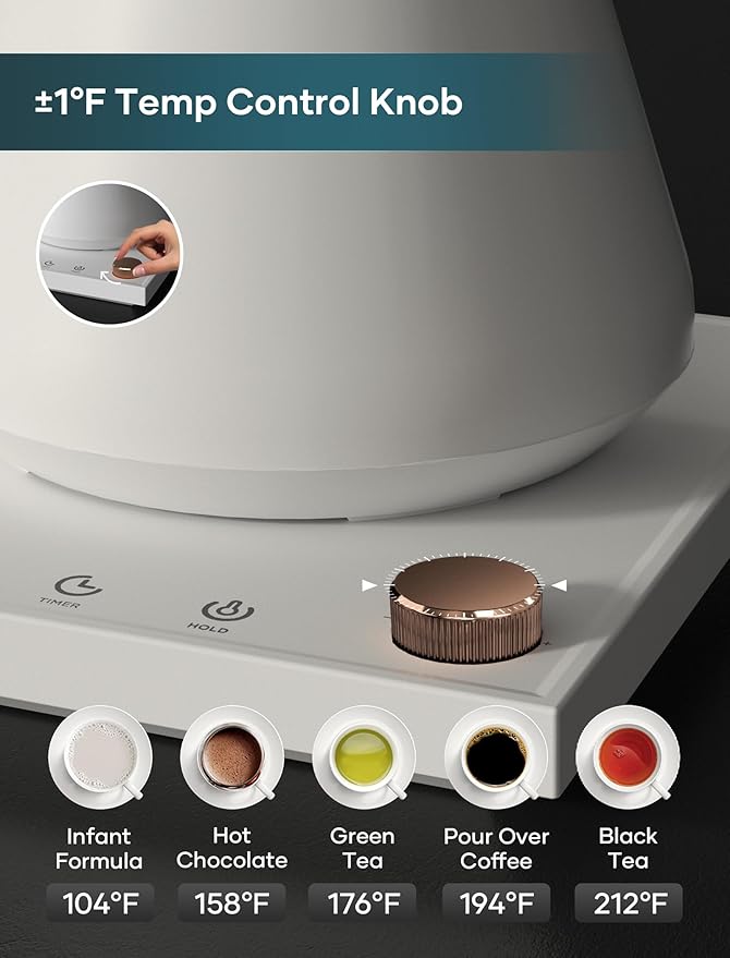 - ±1℉ Precise Temperature Control - Built-in smart program adjusts heating power for accuracy. Perfect for pour-over coffee at 205°F or green tea at 176°F, this electric kettle delivers consistent flavor every time.