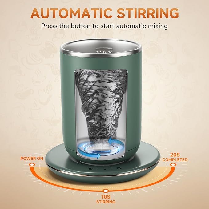 Smart Heated Coffee Mug with Temperature Control, Magnetic Auto Stirring & 3 Heat Levels, Type-C USB Rechargeable Stainless Steel Mug, 8-Hour Shut-Off, Perfect for Desk, Home, Office,Tea – Green 11oz