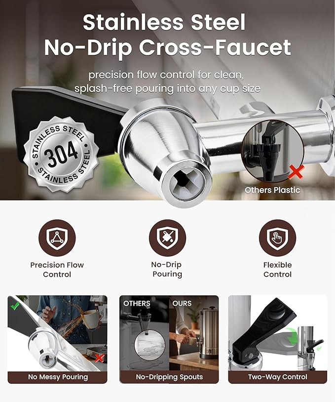 - 𝐃𝐮𝐫𝐚𝐛𝐥𝐞 𝐒𝐭𝐚𝐢𝐧𝐥𝐞𝐬𝐬 𝐒𝐭𝐞𝐞𝐥 𝐍𝐨-𝐃𝐫𝐢𝐩 𝐂𝐫𝐨𝐬𝐬-𝐅𝐚𝐮𝐜𝐞𝐭: Equipped with a heavy-duty all-stainless steel faucet and cross-shaped spout, AZZO 50 cup coffee maker delivers superior durability, safety, and hygiene compared to common plastic faucets. The no-drip design with precise flow control ensures clean, splash-free, and drip-free pouring into cups of any size.