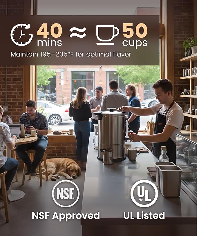 - 𝐇𝐢𝐠𝐡-𝐄𝐟𝐟𝐢𝐜𝐢𝐞𝐧𝐜𝐲 𝟓𝟎-𝐂𝐮𝐩 𝐑𝐚𝐩𝐢𝐝 𝐁𝐫𝐞𝐰 𝐒𝐲𝐬𝐭𝐞𝐦: AZZO large coffee maker brews up to 50 cups (8L) of 5oz servings in just 40 minutes. Its adjustable capacity allows brewing from 15 to 45 cups for smaller groups or the full volume for large gatherings, while keeping coffee hot, fresh, and ready to serve long after brewing. Ideal for catering, weddings, offices, hotels, and special events.