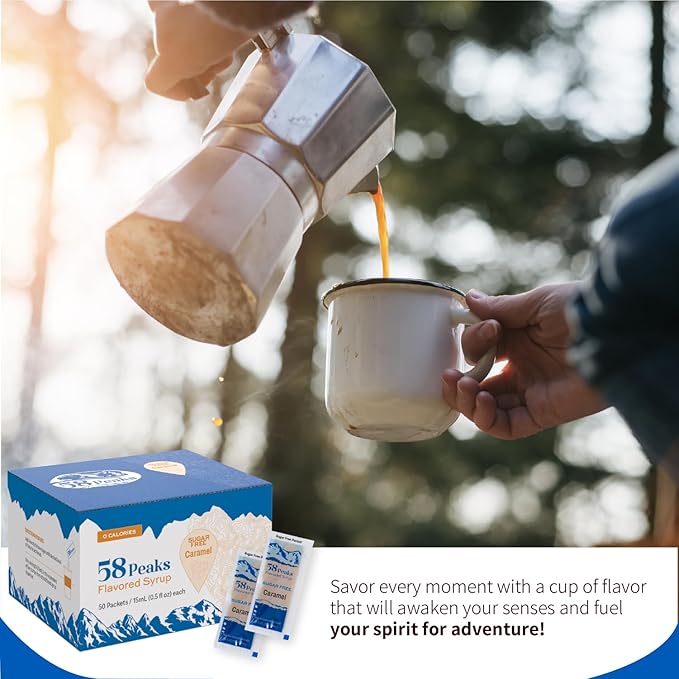 - Café-Style Flavor Anywhere: Bring the coffee shop to your kitchen with 58Peaks flavored syrup packets. Each zero sugar syrup packet transforms your favorite drinks into barista-quality creations. Perfect for home brews, these single serve coffee syrups are your go-to for caramel lattes, caramel iced coffee, or other sugar free coffee indulgences, without the guilt.