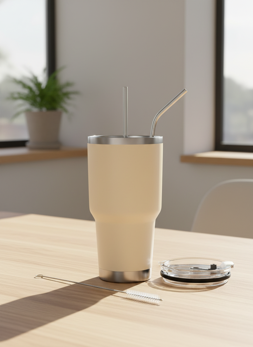 In a workspace often filled with harsh screens and clutter, the soft, creamy matte finish of this tumbler offers a visual pause. It doesn't demand attention; it sits quietly on your desk, providing a neutral, calming point of focus for your tired eyes.